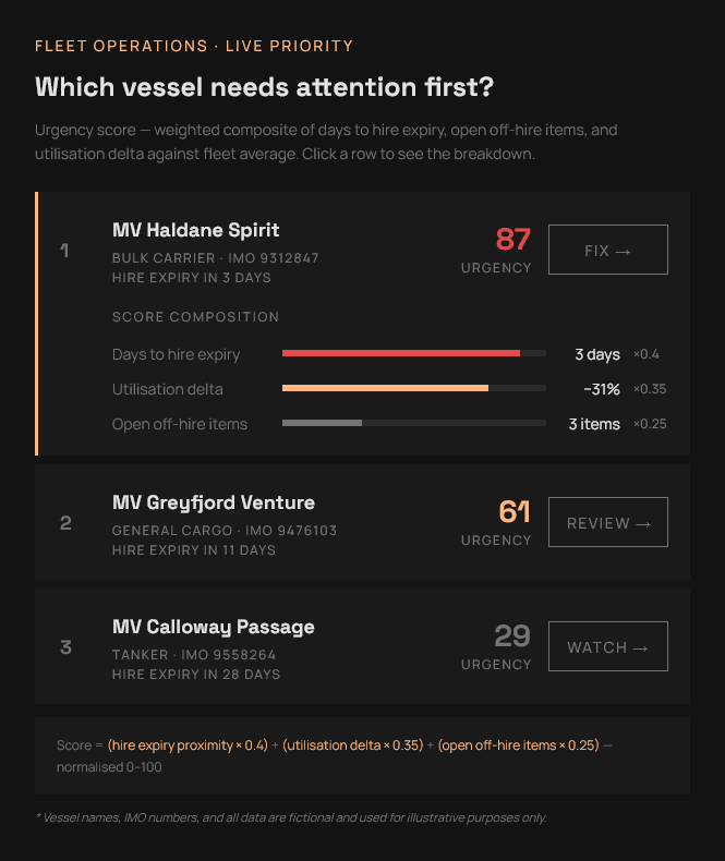 Urgency score — weighted composite of days to hire expiry, open off-hire items, and utilisation delta against fleet average. Click a row to see the breakdown.