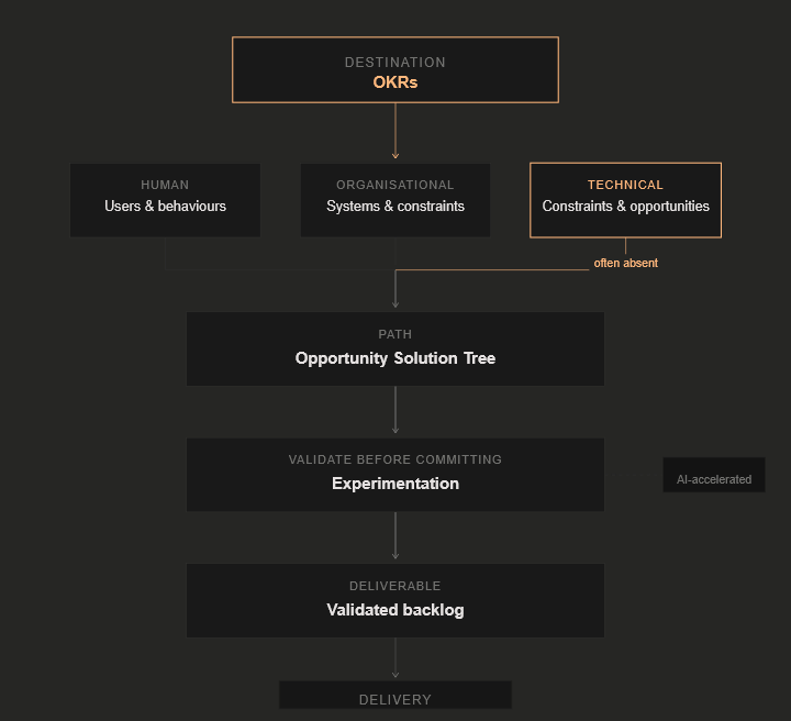 The gap is not filled by involving engineers earlier, though earlier is better than later. It is filled by involving the right kind of practitioner — one whose role in discovery is not to review design decisions for technical feasibility, but to conduct technical research in parallel with human and organisational research from the outset.